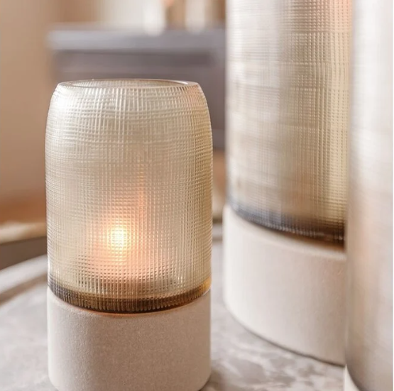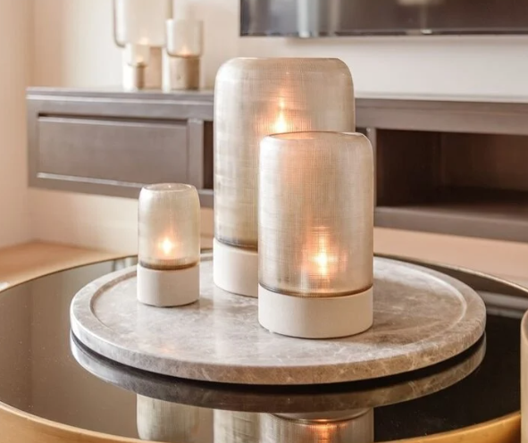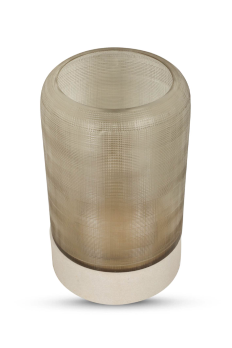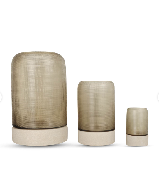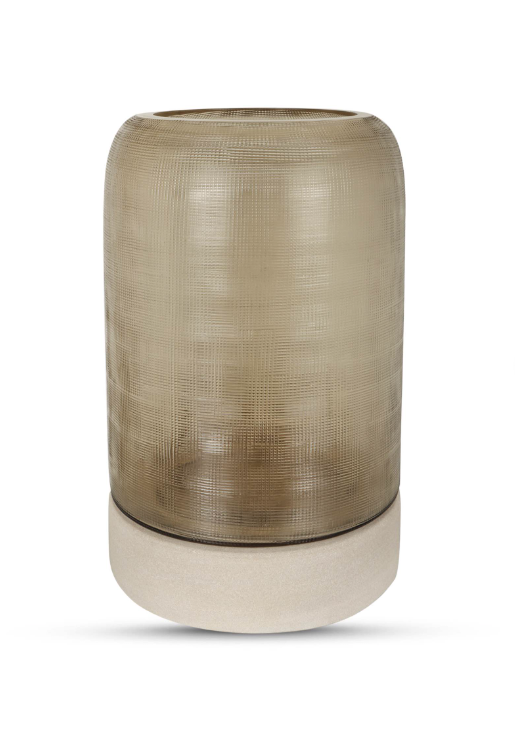 Windlicht Kogan heeft een moderne kleur en ontleent de luxe look aan de ambachtelijke wijze van produceren. Ieder exemplaar is mondgeblazen en met de hand bewerkt, hierdoor zijn kleine imperfecties onderdeel van het product. Het windlicht is verkrijgbaar in drie verschillende maten, maak je styling in één keer af door verschillende maten te combineren. Het glaswerk staat op een voet van zandsteen, wat het een luxe uitstraling geeft.
