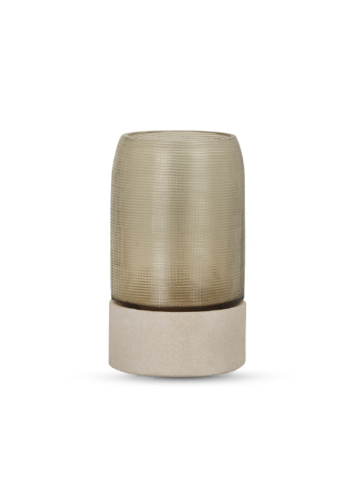 Windlicht Kogan heeft een moderne kleur en ontleent de luxe look aan de ambachtelijke wijze van produceren. Ieder exemplaar is mondgeblazen en met de hand bewerkt, hierdoor zijn kleine imperfecties onderdeel van het product. Het windlicht is verkrijgbaar in drie verschillende maten, maak je styling in één keer af door verschillende maten te combineren. Het glaswerk staat op een voet van zandsteen, wat het een luxe uitstraling geeft.