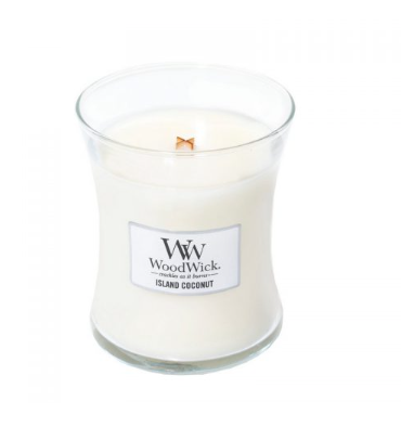 Woodwick Medium Candle Island Coconut : Woodwick Island Coconut geeft je de heelijke geur van sappige ananas gemengd met romige kokos deze creëert de perfecte tropische traktaties.